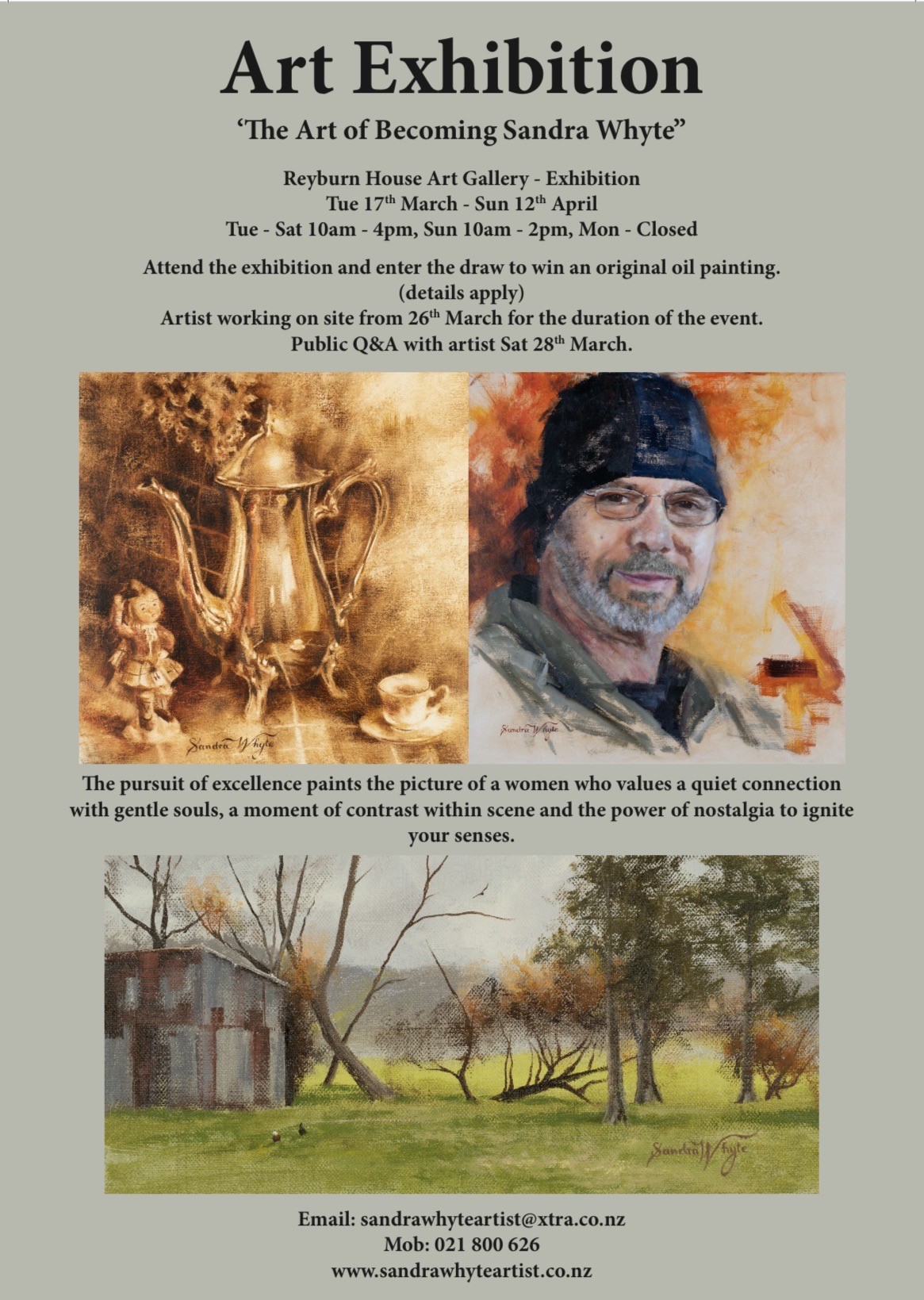 Sandra Whyte is a Northland based contemporary oil painter whose exhibition reflects a five year period of focused learning and artistic development. Returning to the fundamentals of traditional painting, she has worked across portraiture, still life and landscape, building the skills needed to paint with confidence across a wide range of subjects.
